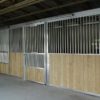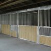 When Mr. & Mrs. Link sent blueprints of their new stable, the back and side walls were constructed of 8” concrete block. The triple stall layout shown in these photographs feature all aluminum headers, columns aluminum stall front grilles with built-in feeder access doors and lumber filled lower stall front panels with 6” inch vertical tongue & groove planking. The Coolbreeze sliding stall door with maximum ventilation feature the additional scuff panel for the Link’s pawing equines. This stall system was manufactured and designed to secure to the two existing concrete dividing partition walls provided by Mr. and Mrs. Link’s builder