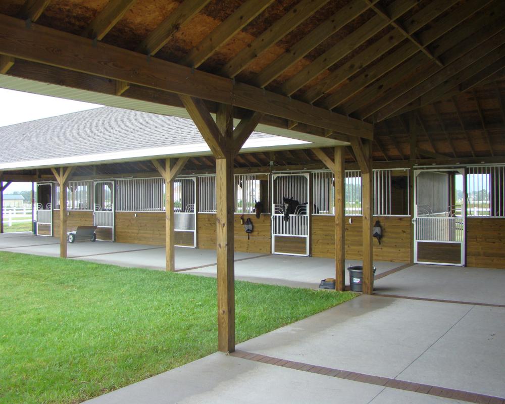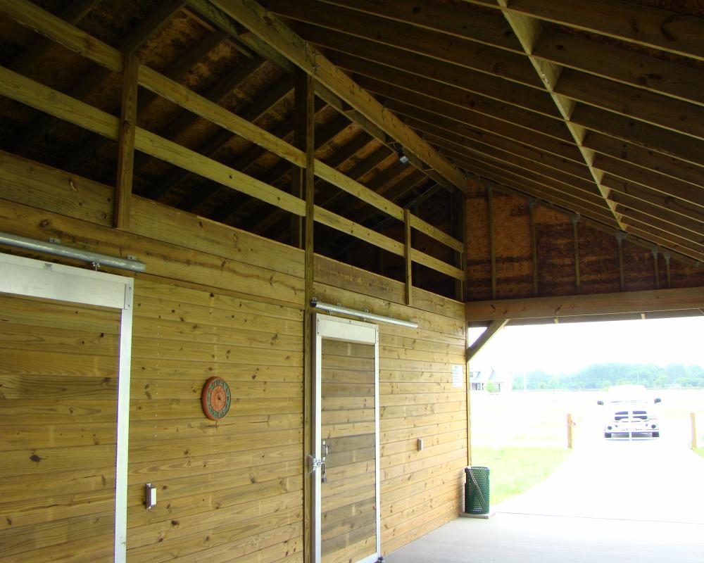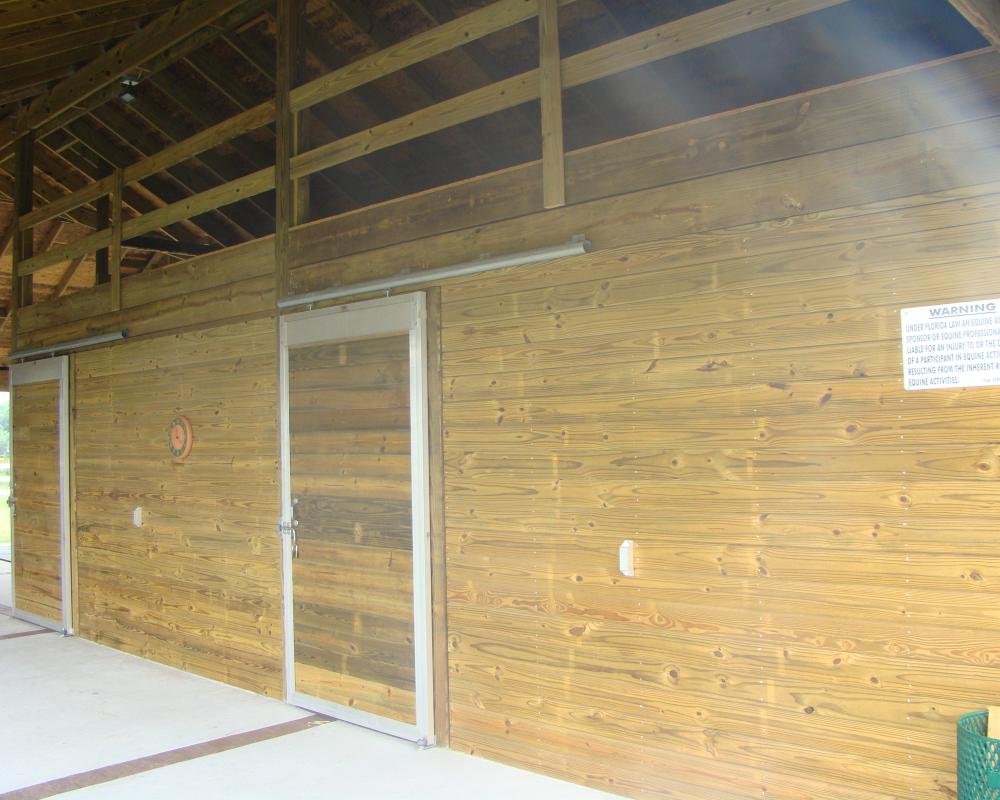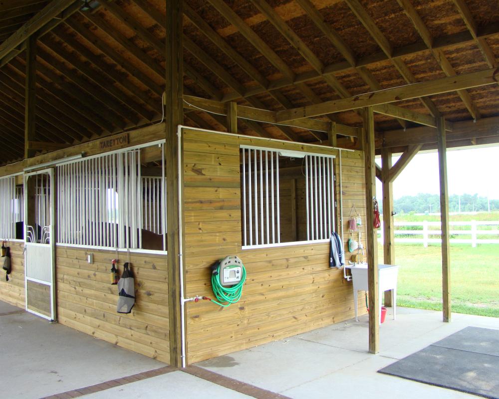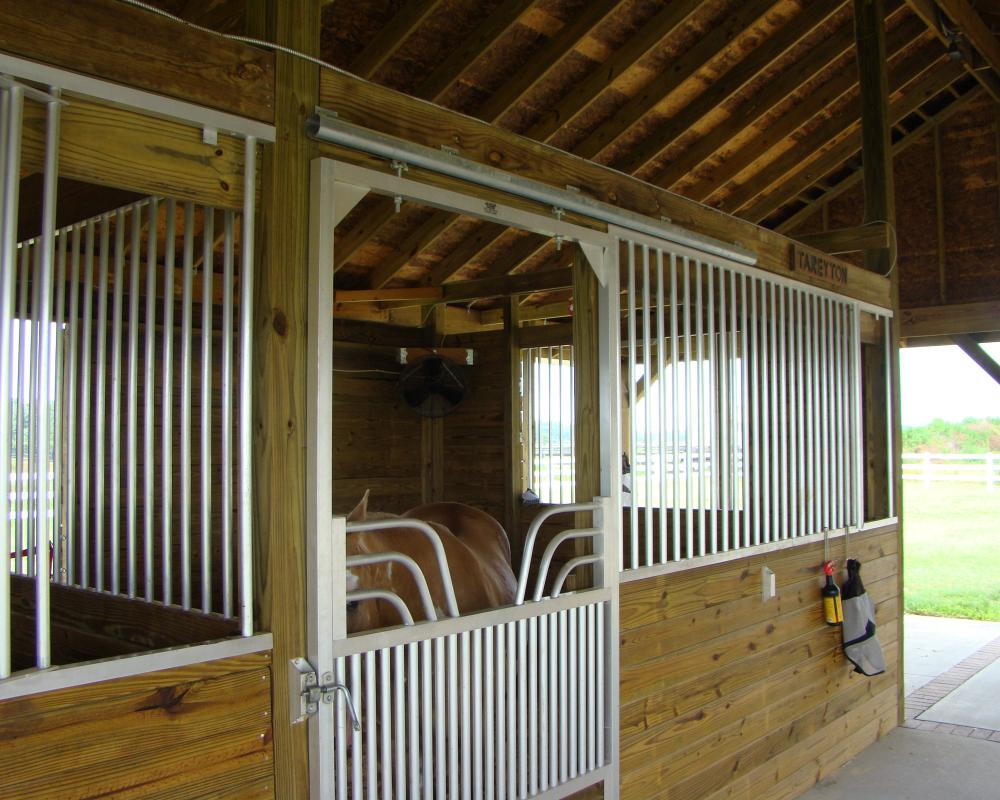 In this 6 stall open air barn construction, Coolbreeze Gossip Sliding Doors were used along side stall front grilles which feature Feeder Access Doors. Gossip Gate Sliding Doors allow horses to view the aisle yet, slide open. The advantage to this style door is less area is occupied in the aisle when opening and no need to latch the gate open like traditionally hinged gates. Feeder Access Doors in each stall front allow quick and easy access to feed horses both hay and grain through the same feed opening. The 8′ tall door frame lines up nicely with the 4′ tall stall front and partition grilles. A window grille on the end of the stall is equipped with a Lift Out Panel to allow the stall occupant freedom to view the wash area. When washing takes place the Panel can be installed quickly to prevent horse’s head to hang out of the stall. The Tack and Feed Room Door Frames have been supplied by Armour while Southern & Traditional Homes installed the horizontal lumber.