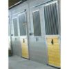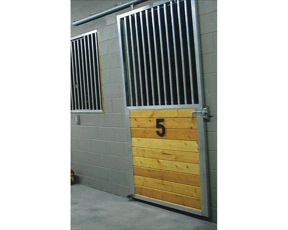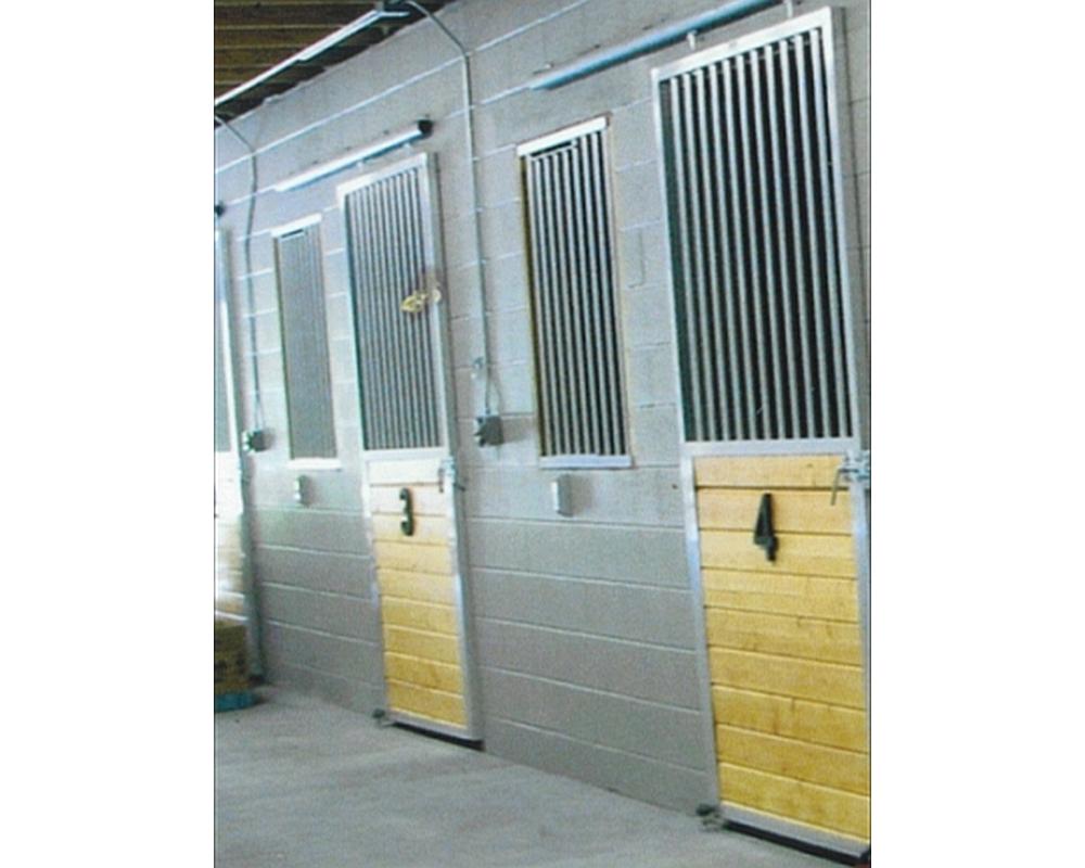 Ms. Fleming built a concrete block structure with 5 stalls. Each stall has installed sliding stall doors in which Ms. Fleming installed the lumber in the lower half. The door height is 96″ and is overlapping a 48″ wide opening. Armour manufactures a 51-1/2″ wide door to overlap a 48″ opening so that the maximum area is achieved for horse and rider to walk through. All Armour doors arrive with hardware for installation plus fasteners (except for concrete installations). Ms. Fleming has a small window opening in place of a full size stall front grille for each stall and the interior of the block has been framed with lumber to close off the hollow block. Each stall grille includes a Feeder Access Door which is the full height of the grille and makes for easy access to hay and grain holders. If you have a custom space that requires filling, please give Armour a call to see if we can accommodate a product to meet your stall need!