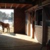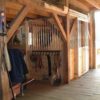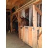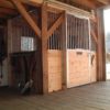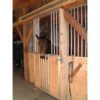 Mrs. Foster contacted Armour Gates with concerns of renovating her barn and installing three stalls for her horse, mule and goat, Bonnie. Mrs. Foster wished to keep the large lumber knee braces which supported her pet’s home. As you can see in the front of each stall, lower lumber walls were built using receiver channel on the inside edge of posts and stall front grilles are mounted from the inside of the stall. The stall doors each slide over the knee braces on the 8’0″ track mounted to a 2″ x 10″ header board.
