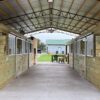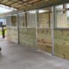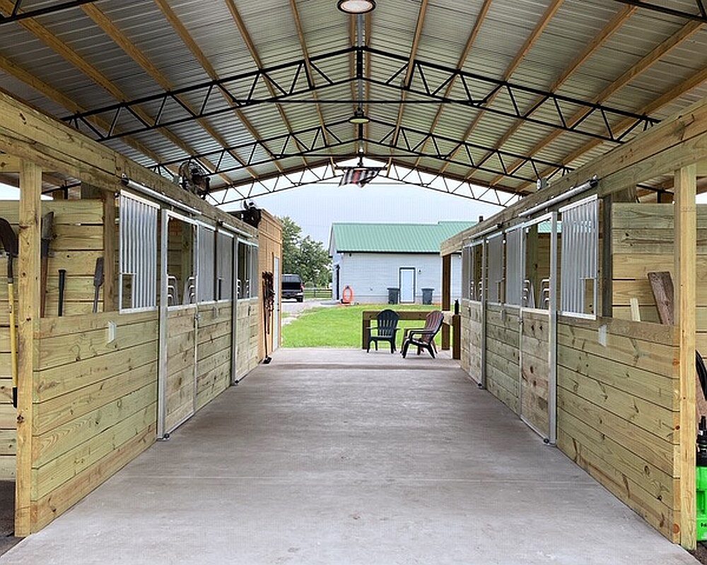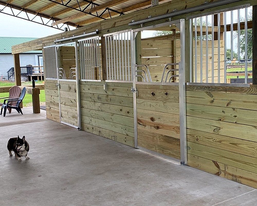Mr. & Mrs. Gould reached out to Armour for products to outfit their new 4 stall barn. The goal was adequate airflow throughout and by appearance, it looks like their goal was met! Sliding stall doors with a Gossip Top were chosen and loaded with the same lumber used throughout the stall and barn to match aesthetically. Divider wall boards were spaced with slight gaps in between to increase probability of airflow. Stall Grills were chosen with a 3″ between bar spacing and Cut Out holes in grills allow for quick feeding with a scoop.