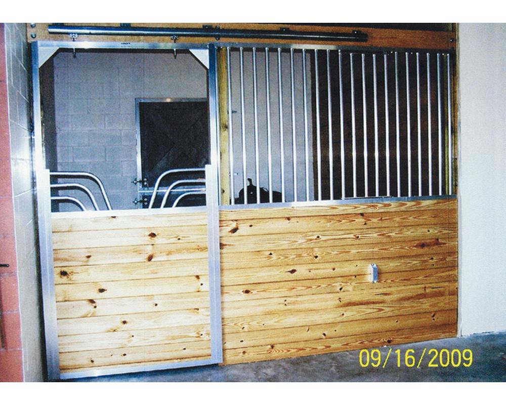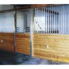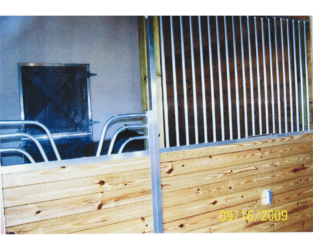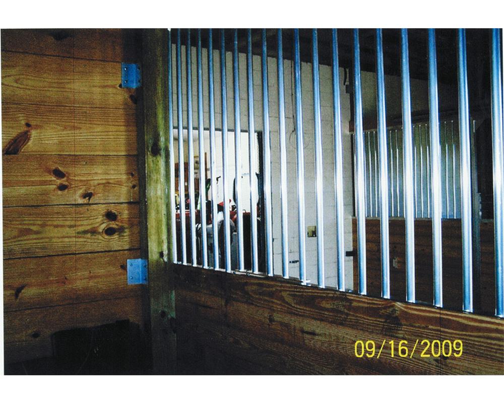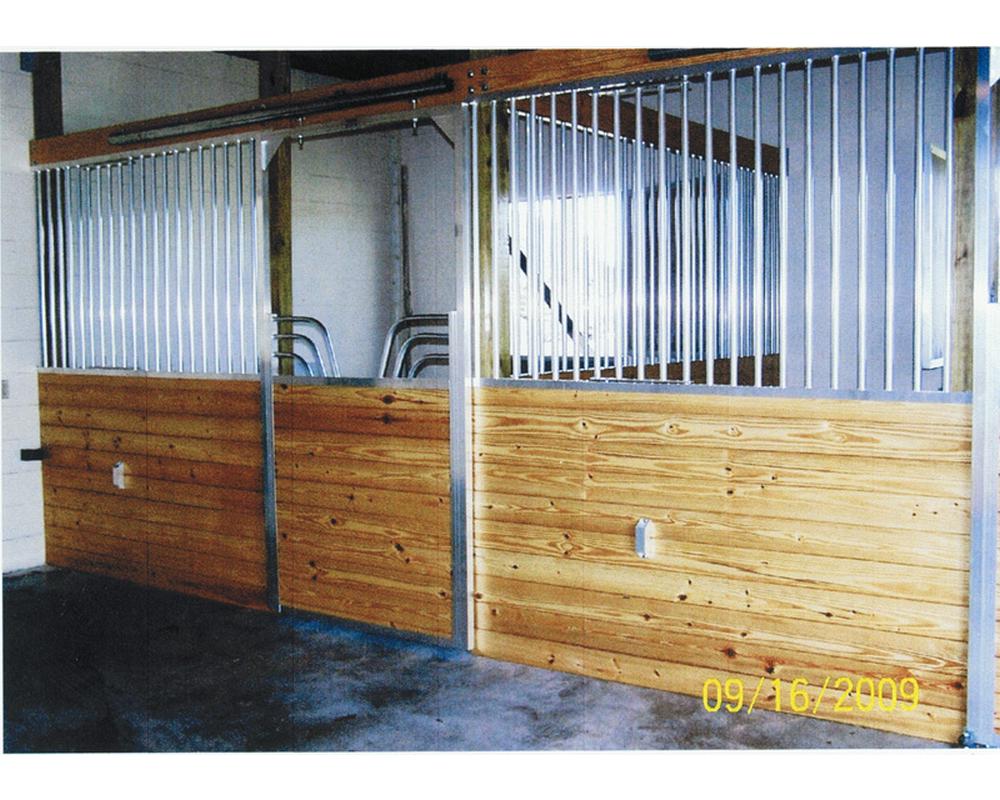 The 4 stall Hill Barn was constructed in 2009. Owners equipped their concrete structure with lumber interior walls and posts. Gossip Sliding Gate Frames were purchased and all the same Tongue & Groove lumber was used throughout the barn, stall doors and end barn door frames. The overall appearance is uniform and symmetrical. Stall grilles are 4′ high to match the overall door frame, as well as, the divider grille partition.