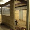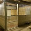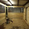 Mr. Noffsinger equipped his two stall metal barn with Armour’s Coolbreeze sliding stall doors which feature a spring loaded fold down top which allows his horses to hang their head out and view the aisle or immediately be retained with just a flip of the wrist. The stall front grilles are standard 48″ heights and 90″ widths with the Feeder Access Door built in for easy stall access for feeding. Additional stall dividing partitions with the same 48″ heights and 3″ between bar spacing were added for full view and ventilation. Receiver Channels below the stall divider grilles hold horizontal lumber in place and construct the partition wall. Crossbuck lumber Dutch doors were added to the rear of the horse stalls for quick exit from the rear of the barn.