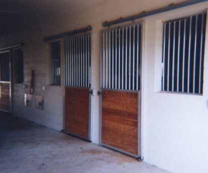 Concrete Barn Interior, Horizontal T&G Sliding Stall Door, T&G Gossip Stall Gate, Unique Stall Front Grilles, Feeder Access Doors, 4 Stall barn