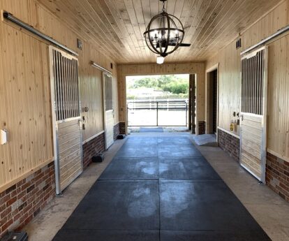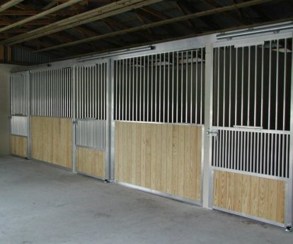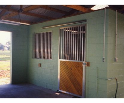 Concrete Construction Barn, Stall Front Grilles, Feeder Access Doors, Vertical T&G Sliding Door, Coolbreeze Sliding Door with Scuff Panel and Spring Loaded Fold Down Panel, 6 Stall Barn, Aluminum Headers, Aluminum Columns, Vertical T&G Stall Front Wall Panel, Promote Ventilation, Custom Built Stalls, Custom Size Grilles