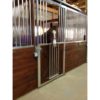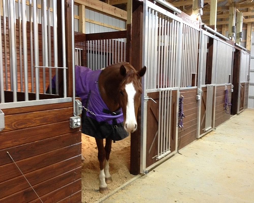 Parker’s Place owned by Kat Draughon purchased Armour’s classic Crossbuck Sliding Door with fold down feature. The Crossbuck has been stained the same color as the remaining stall wall and as you can see, a rich, warm look has been accomplished. The aluminum product shines nicely with and without the lights on and keeps the barn visible with the exterior doors opened or closed. Dividing partitions, which are grilles as well, also add visibility and the opportunity for increased ventilation. If you like what you see here and are shopping for stall components for your barn, please give us a call today, we’d be happy to assist you in choosing components that would best fit your barn!