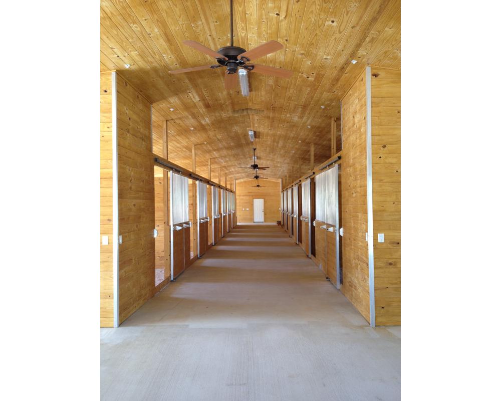 Mr. Bache with Bache Development contacted us on behalf of his customer Mr. Plante in regards to his 12 stall barn. The 6″ tongue and groove walls, ceiling and stalls make for quite a showplace! Armour provided the 8′ tall stall doors with standard bar top and stall front grilles to sit aside each front. Solid wall partitions were installed using Receiver Channel, a channel in which the boards slide into horizontally to create dividing or partition walls. Stall doors arrived with round track, ball bearing trolleys, adjustable stay roller and stall latches. Fasteners for installation of all the hardware and grilles were included. Blanket bars of 36″ length were mounted to the front of each stall door for easy handling and storage.