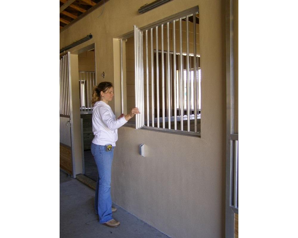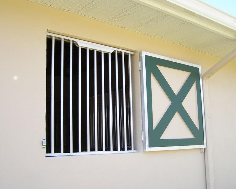 Additionally, the barn exterior has installed, Crossbuck Single Swing Hinged, shutters in the “reverse fascia” position, so the “x” shows when the barn shutter is in the open position. This was chosen because the panel will be open most of the time. Window grilles, with lift out panels, keep horses from cribbing and allow horses to hang their heads out of the window opening.