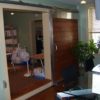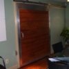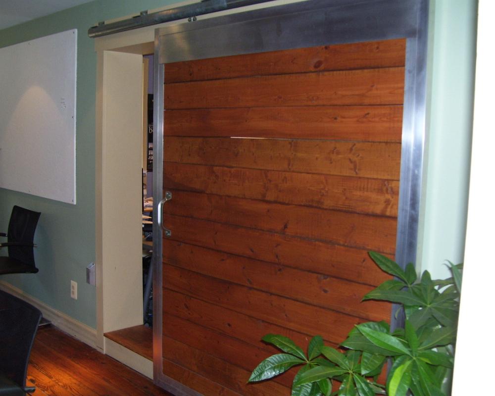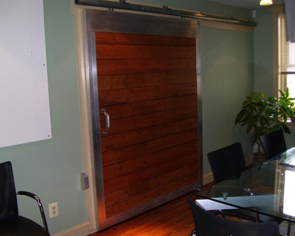 Zavos Architecture & Design out of Frederick Maryland wanted a bit of a barn feel and appearance to their office space. This wasn’t the first time Armour Sales Staff heard of this idea, so the order was easy to supply: Zavos provided the opening measurements they wanted to cover and Armour manufactured a frame to fit! Lumber was installed in 2″ x 6″ size and stained on sight. The door now closes the space between and office and the conference table!
